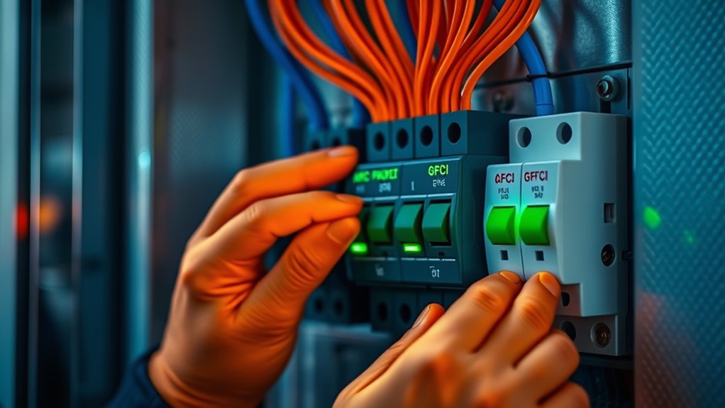 You should test GFCI and arc-fault devices monthly to make certain proper device calibration and safety. Regular testing helps catch issues early and maintains their reliability. For the best results, use the test buttons on each device, and consider professional inspections annually or if you notice any malfunction. Consistent testing frequency keeps your safety devices functioning correctly and reduces the risk of electrical hazards in your home or workplace.