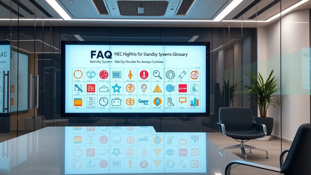 Have you ever wondered what the NEC specifically defines when it comes to standby power systems? The NEC clarifies key terms like generator sizing and battery backup. Generator sizing refers to selecting the appropriate capacity to support essential loads during power outages, ensuring reliability without overloading the system. It’s critical because an undersized generator won’t meet demand, while an oversized one can be inefficient and costly. Battery backup, on the other hand, provides immediate power when the main source fails, acting as a bridge until the generator starts or during short outages. The NEC emphasizes that these systems must be correctly specified and maintained to ensure safety and functionality. Understanding these definitions helps you ensure compliance and effective design of standby power systems. Additionally, understanding grocery savings strategies can help reduce operational costs associated with maintaining backup systems.