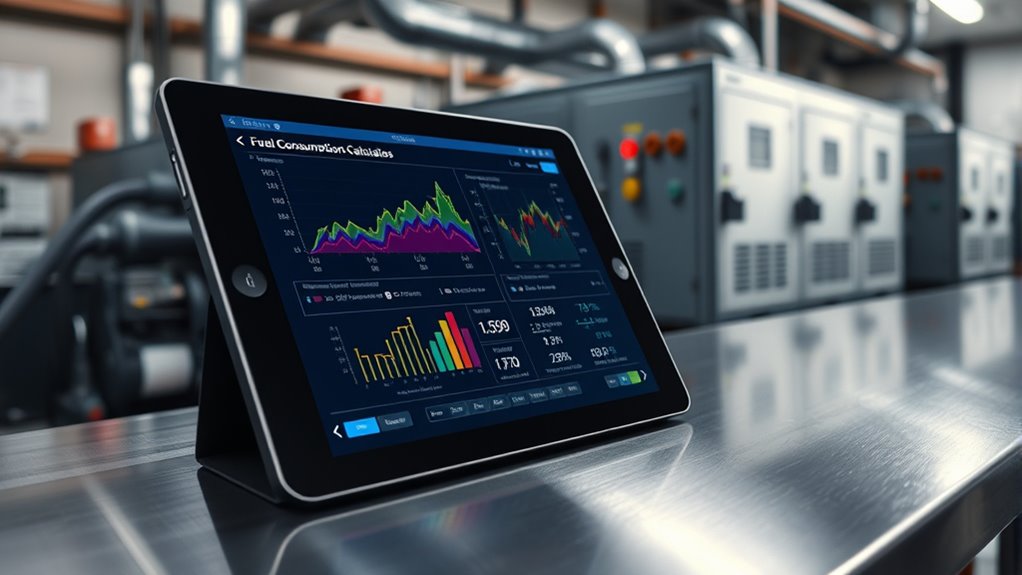 To calculate fuel consumption for your standby generator, start by knowing its power output and efficiency, then divide the load by efficiency to find hourly fuel use. Multiply this by the planned runtime to determine total fuel needed. Keep in mind factors like ambient temperature and maintenance, which can affect efficiency. Mastering these calculations helps you avoid shortages and optimize costs—continue further to learn the key factors and practical tips for accurate estimates.