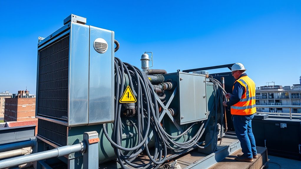 When installing a generator on your rooftop, you’ll face structural, safety, weatherproofing, and noise challenges. You need to evaluate and reinforce the building’s structure, follow electrical codes, and guarantee proper grounding. Weatherproofing is essential to protect components from elements, and soundproofing helps reduce noise impacts. Additionally, regulatory standards govern installation and noise levels. If you keep exploring, you’ll discover how to confidently navigate these challenges and ensure a safe, compliant setup.