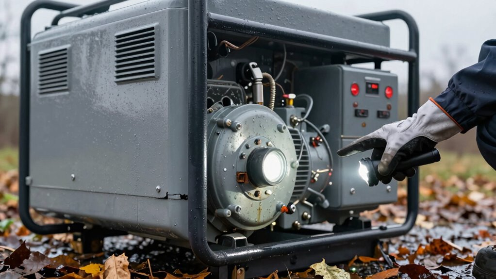 While inspecting these components, also look for any physical damage to the generator itself, including cracks, dents, or bent parts. Check the cooling system, including the radiator and hoses, for leaks or blockages. After a storm, debris can get lodged in vents or fans, so clear out any obstructions to allow proper airflow. If your generator has a protective cover or enclosure, verify that it’s still intact and properly fitted. Once you’ve completed a visual inspection of the fuel system, electrical connections, and physical condition, perform a test run to confirm everything operates smoothly. Additionally, understanding the role of contrast ratio can help you assess the overall quality of your generator’s components and their ability to handle different lighting conditions. Always follow safety protocols during inspections, and if you’re unsure about any damage, it’s wise to have a professional technician assess your generator before relying on it again. This careful inspection helps ensure your generator remains safe and ready to provide power when it’s needed most after a storm.