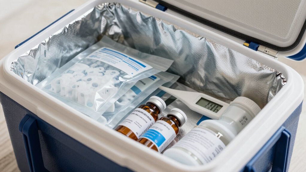 Some medications are more vulnerable to temperature fluctuations, especially biologics, insulin, and certain vaccines. These drugs require strict temperature stability to remain effective. You should store them using proper methods like insulated coolers, ice packs, or portable refrigeration units. Regularly monitoring the storage temperature during an outage helps guarantee these sensitive medications stay within safe limits, preventing degradation and maintaining their efficacy.