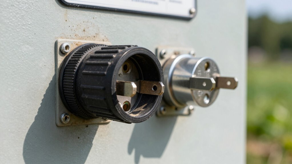 Weather conditions can greatly impact your 50 amp and 30 amp connections, affecting electrical compatibility and weather resilience. Moisture, rain, and snow can cause corrosion or short circuits if connections aren’t properly sealed or rated for outdoor use. Extreme temperatures can also strain the wiring. To guarantee safety and reliable operation, choose weather-resistant outlets and cover them securely, especially during harsh weather, and regularly inspect your connections for any signs of damage.