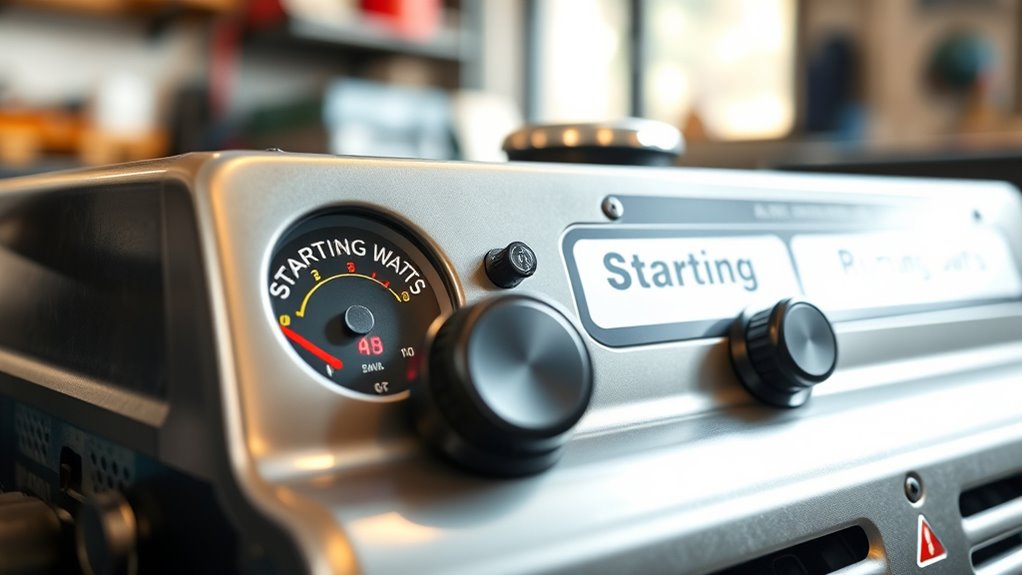 Understanding the key differences between starting and running watts is essential when selecting a generator or power supply. Starting watts, also known as surge capacity, refer to the extra power needed for appliances when they first turn on, like refrigerators or power tools. Running watts, or continuous power, is the steady amount your device consumes during normal operation. Knowing these differences helps you avoid underpowering your equipment. If you only consider running watts, you might not have enough surge capacity for initial startup, leading to appliance issues or generator overload. Always check both ratings to ensure your power source can handle the initial surge and provide steady, reliable power during operation. This approach guarantees your devices run smoothly without interruption or damage. Additionally, understanding somatic therapy techniques can help in managing stress or trauma that may affect your energy levels during these processes.