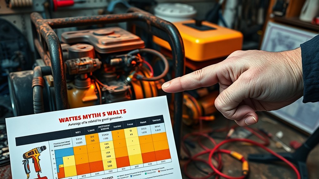 Ignoring the difference between starting and running watts can lead to costly damage, higher fuel bills, and unnecessary oversizing of your generator. Many believe that equipment always needs maximum wattage, which often results in overestimating power needs. This oversight can shorten the lifespan of appliances and increase expenses. To avoid these hidden costs, it’s essential to accurately assess your load and match wattages properly. Keep exploring to uncover how you can save money and prevent damage.