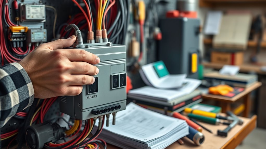 Wiring and installation mistakes can lead to serious safety hazards and costly repairs. One common error is underestimating wiring complexity, which can cause improper connections or overloads. Misunderstanding installation procedures may result in incorrect setup, risking damage to the transfer switch or your electrical system. Failing to follow manufacturer guidelines or skipping essential steps can compromise safety and reliability. For example, improper grounding or loose connections can cause sparks or electrical fires. Always verify you understand the wiring diagrams and adhere to local codes. Rushed installations or neglecting detailed instructions can lead to vetted errors that compromise safety and increase costs. Taking the time to get wiring and installation right saves money and keeps your system safe and operational in emergencies.