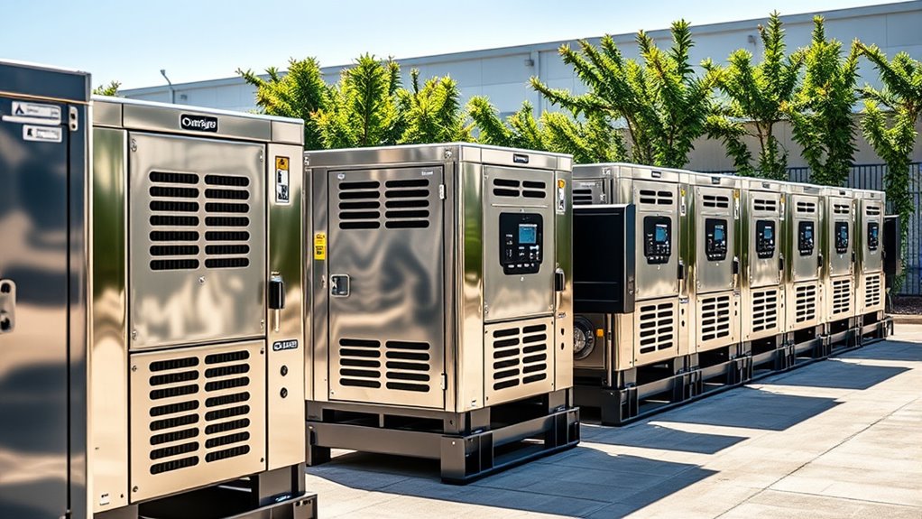 Selecting a Champion 20KW standby generator means ensuring it supports your preferred fuel type, whether that’s propane, natural gas, or gasoline. You want a unit that matches your available supplies for convenience and cost-efficiency. Check if it can switch seamlessly between fuel types or if it requires manual changes; flexibility can be a big advantage. Also, verify the generator’s compatibility with your existing fuel infrastructure, like gas lines, tanks, or cylinders, to simplify installation. Consider each fuel’s efficiency and runtime—natural gas often provides longer operation with less refueling, which can be a big plus. finally, confirm that the generator’s fuel system and components are certified for safe, reliable operation with your chosen fuel, ensuring safety and longevity over time.