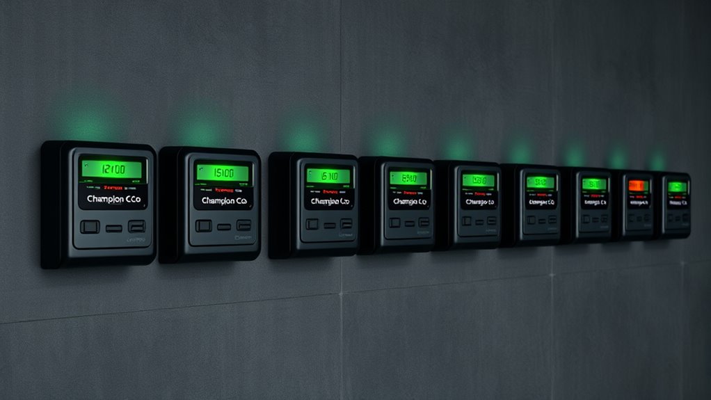 When selecting a Champion CO alarm for your generator, verifying that it meets recognized safety standards is key to guarantee reliable protection. Look for alarms certified under standards like UL2034 and NFPA 720, which ensure proper detection and safety features. These certifications indicate the alarm has been tested for reliability and compliance. Additionally, choose models with features such as auto shutoff and tamper-resistant designs to meet safety regulations. Confirm that the alarm is rated for your environment, whether residential or industrial, by checking for UL listing. It’s also wise to select alarms with clear expiration indicators or lifespan certifications, typically around 5 to 7 years, to assure ongoing safety and effectiveness. These standards help you trust that your CO alarm will perform when needed most.