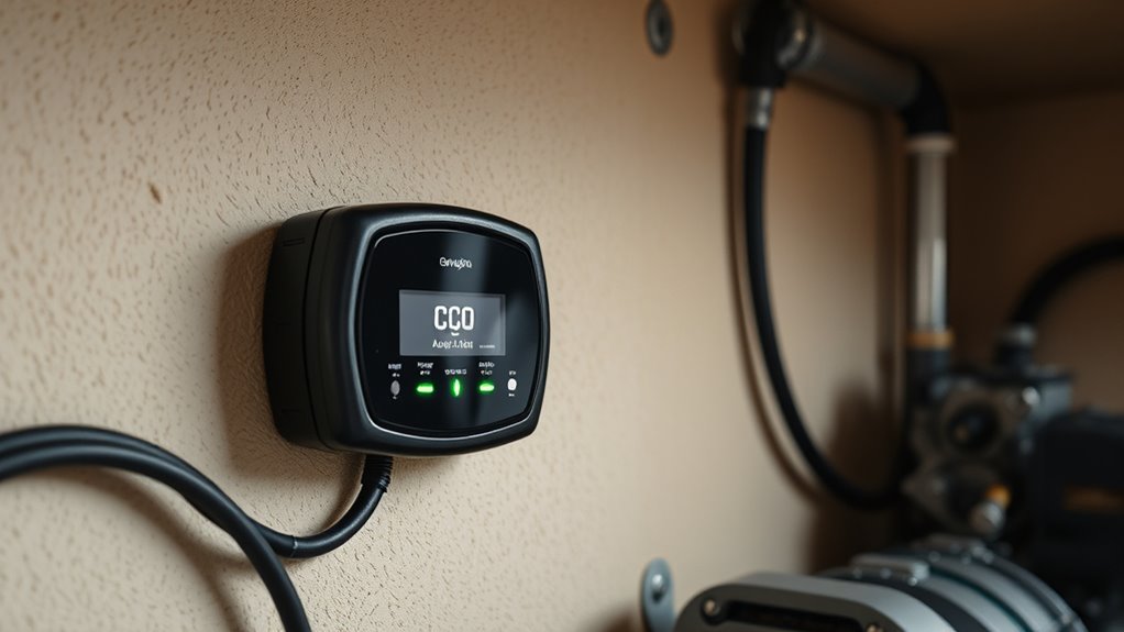 Choosing a CO alarm with the right detection range and sensitivity is vital for ensuring your generator’s safety during hurricanes. I look for alarms that can detect CO levels as low as 30 ppm, providing early warnings before dangerous concentrations build up. Sensitivity should be adjustable or calibrated so the alarm responds reliably to typical generator emissions without false alarms from ambient conditions. A broad detection range, from 0 to 999 ppm, allows quick identification of both minor leaks and dangerous high levels. I prioritize alarms with electrochemical sensors, which offer higher sensitivity and accuracy compared to other types. Rapid response times—ideally within 30 seconds to a minute—are essential for prompt alerts, giving me enough time to take action and protect my home during emergencies.