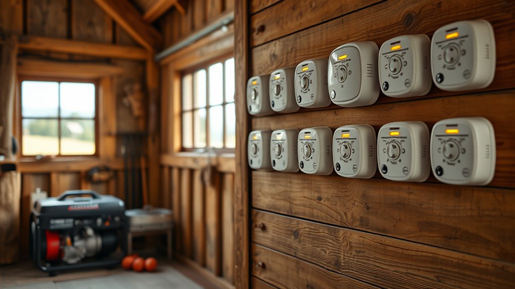 If you’re looking to keep your family safe during power outages or outdoor activities, I recommend the top CO alarms that combine reliability, quick alerts, and backup power. From battery-powered detectors with digital displays to multi-gas units equipped with sensors for added safety, there are options for every rural home. To guarantee maximum protection, consider alarms with loud sirens, long-lasting batteries, and proper placement. Keep going for detailed insights on the best models and features.