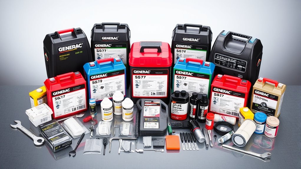 If you want your Generac generator running smoothly, using the right maintenance kit is key. These kits come with OEM filters, oils, spark plugs, and tools tailored for specific models, making DIY upkeep simple and cost-effective. Regular use helps prevent breakdowns and extends your generator’s lifespan. To find the best fit, you need to evaluate your model, engine size, and maintenance needs. Keep going, and I’ll share more tips to keep your power reliable.