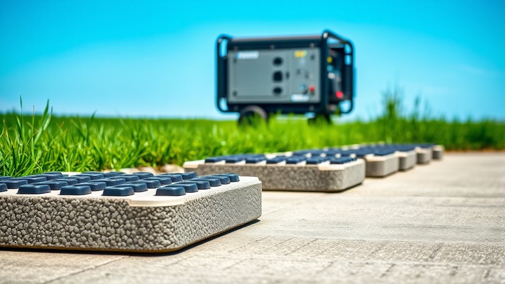 Have you considered how the durability of your generator base pad affects its long-term performance? The right material can withstand harsh outdoor conditions like UV rays, moisture, and temperature swings without cracking or degrading. High-quality options such as reinforced concrete, UV-resistant plastic, or durable rubber are essential for lasting stability. These materials help maintain the pad’s load-bearing capacity and prevent ground movement or settling over time. Weather-resistant materials also resist mold, corrosion, and environmental damage, preserving structural integrity. Choosing a material with proven longevity means fewer replacements and lower costs in the long run. Ultimately, durable materials ensure your generator remains stable and safe, no matter the weather or outdoor conditions, providing peace of mind and reliable operation.